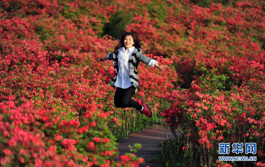 5月7日,一名游客在湖南長(zhǎng)沙瀏陽市大圍山國家森林公園內(nèi)的花叢中跳躍。