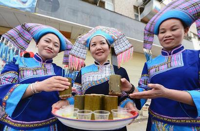 央廣網(wǎng)河南分網(wǎng)消息 當日是廣西田林縣壯族民間傳統(tǒng)的“吼敢”節(jié),當?shù)貥防镦?zhèn)新昌社區(qū)壯族群眾舉行“吼敢”百家宴,上千名鄰里居民和來自四面八方的賓客一起聯(lián)誼,共同品嘗壯家風味菜,其樂融融。 “吼敢”(壯語譯音)是桂西一帶壯族地區(qū)的民間傳統(tǒng)歌圩節(jié),起源于青年男女幽會對唱情歌、找意中人的民間活動,也叫做“風流節(jié)”,每年農(nóng)歷三、四月間舉行,同一區(qū)域的壯族村屯相繼舉辦歌圩節(jié),幾乎每隔三天兩日就有歌圩節(jié)活動。歌圩當日除了對唱山歌、表演壯劇外,家家戶戶都設宴招待客人。如今,“吼敢”不僅是男女青年幽會的活動,也是當?shù)貕选h、瑤、苗各族群眾互相往來,交流思想,增進村與村、各民族之間友誼情感的聚會。新華社發(fā)(韋萬忠 攝)