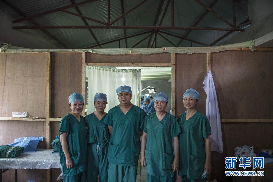 5月10日,在尼泊爾首都加德滿都,(從左至右)成都軍區(qū)總醫(yī)院急診科護(hù)士孫進(jìn)、朱妍、麻醉師李軍、代雪梅、護(hù)士長(zhǎng)安虹在創(chuàng)傷救治中心手術(shù)室門外合影。