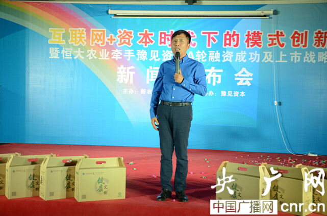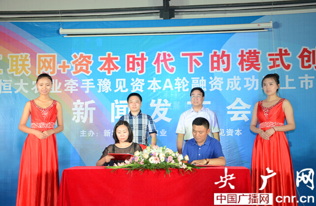 央廣網(wǎng)河南分網(wǎng)6月20日消息 (記者 汪寧)2015年6月19日下午,由新農(nóng)商·恒大農(nóng)業(yè)與豫見資本共同舉辦的“互聯(lián)網(wǎng)+資本時代下的模式創(chuàng)新暨恒大農(nóng)業(yè)牽手豫見資本A輪融資成功及上市戰(zhàn)略新聞發(fā)布會”在湯陰縣菜園鎮(zhèn)葛莊村新農(nóng)商?恒大農(nóng)業(yè)基地隆重舉行,標(biāo)志著“互聯(lián)網(wǎng)+資本時代下的模式創(chuàng)新”工作進(jìn)入了全新的階段。