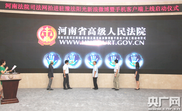 央廣網(wǎng)河南分網(wǎng)7月15日消息(記者 陳保來)今天上午,河南高院司法網(wǎng)拍進(jìn)駐新浪微博和省法院官方網(wǎng)站手機(jī)客戶端上線儀式啟動,河南省法院院長張立勇、河南省互聯(lián)網(wǎng)信息辦公室專職副主任蔡新民等領(lǐng)導(dǎo)嘉賓和媒體記者、網(wǎng)絡(luò)大V、熱心網(wǎng)友出席儀式。