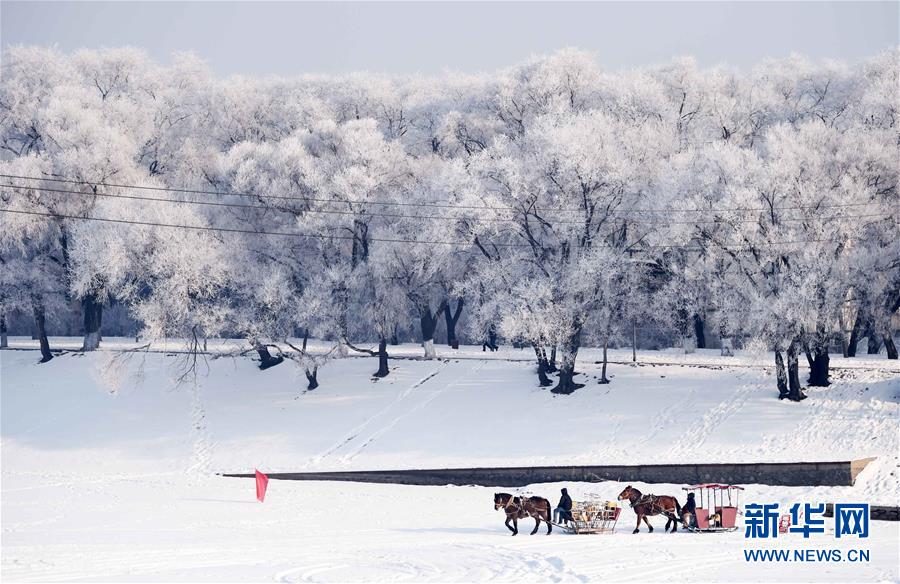 12月25日,在太陽島風(fēng)景區(qū),兩輛馬拉雪橇從一處?kù)F凇景觀經(jīng)過。當(dāng)日,享譽(yù)國(guó)內(nèi)外的冰城哈爾濱市5A級(jí)景區(qū)太陽島風(fēng)景區(qū)迎來霧凇景觀。太陽島上的草木被霧凇裝點(diǎn),晶瑩剔透、美不勝收。 新華社記者 王建威攝