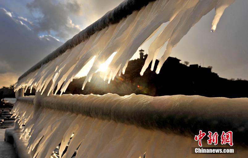 央廣網(wǎng)河南分網(wǎng)消息 受連日寒潮影響,素有“人間仙境”之稱的山東蓬萊海濱出現(xiàn)了冰掛奇觀。在大風(fēng)、浪涌和低溫的共同作用下,浪花瞬間凝固結(jié)冰,并依附于丹崖、護(hù)欄、礁石之上,形成各種形態(tài)的冰掛,成為一道奇景。圖為蓬萊海濱現(xiàn)冰掛奇觀。 高遠(yuǎn) 攝