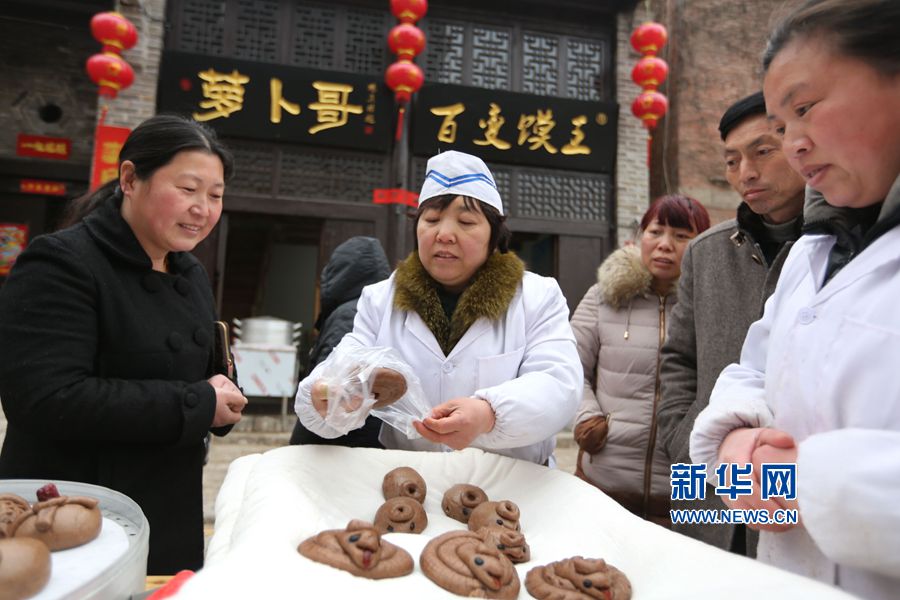 央廣網(wǎng)河南分網(wǎng)消息 2016年3月6日,農(nóng)歷正月二十八,河南省滑縣道口火神廟會正會當(dāng)天,道口鎮(zhèn)歷史文化商業(yè)街蘿卜哥“百變饃王”特色小吃店前,市民群眾正在搶購黑饃饃。新華網(wǎng)發(fā)(畢興世 攝)