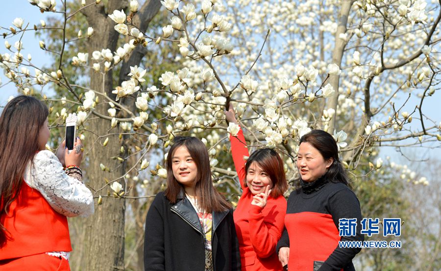 3月10日,市民在河南省夏邑縣栗城廣場盛開的玉蘭花叢中拍照。