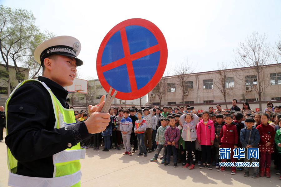 3月28日,一名交警在河南省溫縣徐堡小學(xué)指導(dǎo)學(xué)生認(rèn)識交通標(biāo)識。