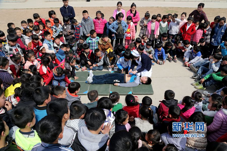 3月28日,一名醫(yī)務(wù)工作者在河南省溫縣徐堡小學(xué)指導(dǎo)學(xué)生學(xué)習(xí)心肺復(fù)蘇急救技能。