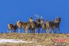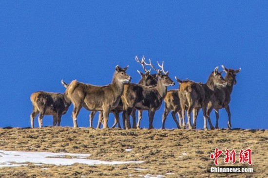 •   4月中旬,金雕、西藏野驢、白唇鹿等珍稀野生動物現(xiàn)身甘肅張掖市肅南裕固族自治縣。近年來,當(dāng)?shù)丶訌妼σ吧鷦游锏谋Wo,野生動物繁衍生息數(shù)量明顯增長。圖為成群的野生白唇鹿現(xiàn)身甘肅肅南。 郎文瑞 攝