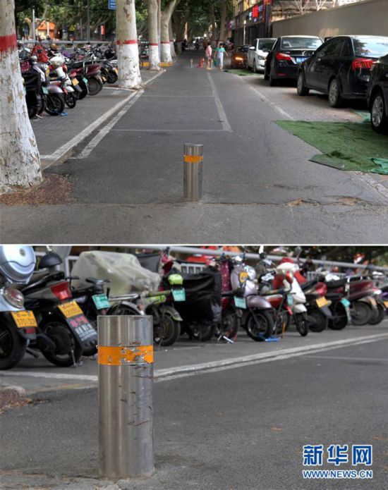 上圖:在鄭州市黃河路經(jīng)七路交叉口附近,市民張女士騎電動(dòng)車撞上的隔離樁安裝在道路中間;下圖:隔離樁上有明顯的碰撞、剮蹭痕跡(拼版照片,7月10日攝)。 近日,有鄭州市民騎電動(dòng)車撞上隔離樁傷重身亡,引發(fā)對(duì)該城相關(guān)管理問(wèn)題關(guān)注。新華社記者走訪鄭州街頭,發(fā)現(xiàn)亂象不少:有行人因隔離樁設(shè)置違規(guī)受傷、有“幽靈”停車位常致車主罰款、有無(wú)證圍擋長(zhǎng)期不撤反成收費(fèi)停車場(chǎng)、有馬車跑上大馬路、有電動(dòng)車竄上人行道、有斑馬線上拍婚紗照…… 新華社記者 李安 攝 新聞鏈接: -