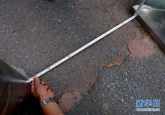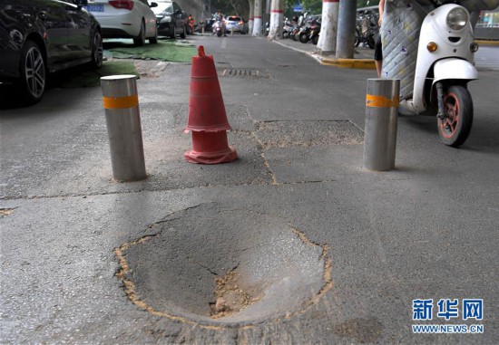 這是鄭州市黃河路經(jīng)七路交叉口附近的一處隔離樁,隔離樁中間路面有大坑,市民只能從兩側(cè)狹窄的通道通行(7月10日攝)。 新華社記者 李安 攝 -