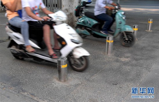 市民騎著電動(dòng)車從鄭州市黃河路與東三街交叉口附近一處路口安裝的隔離樁間駛過(guò)(7月10日攝)。 新華社記者 李安 攝 -