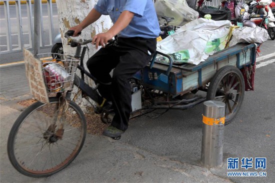 一位騎三輪車的市民從鄭州市黃河路經(jīng)七路交叉口附近一處隔離樁間狹窄的通道通過(guò)(7月10日攝)。 新華社記者 李安 攝 -