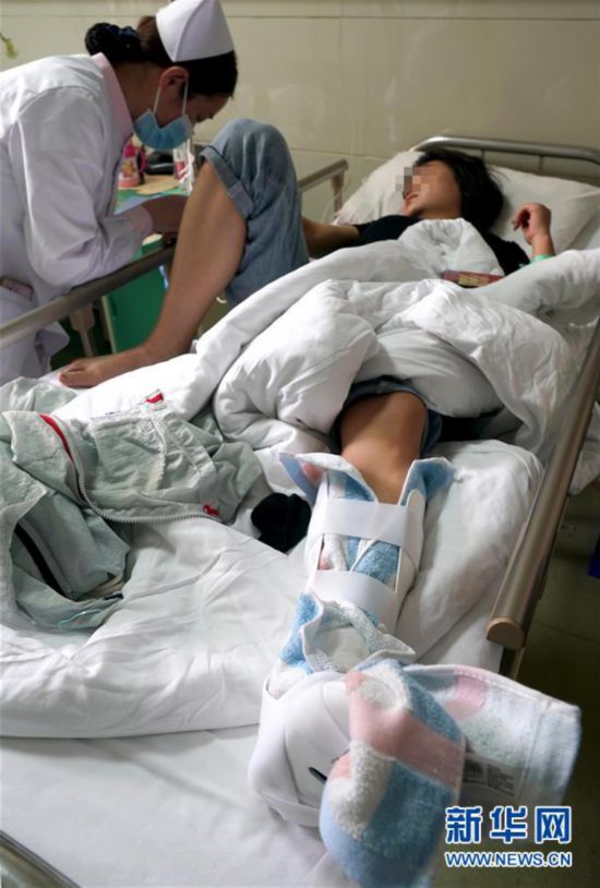 一位市民在鄭州大學(xué)第二附屬醫(yī)院接受治療,她的腳因?yàn)轵T電動(dòng)車碰上隔離樁受傷(7月15日攝)。 新華社記者 李安 攝 -