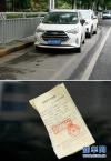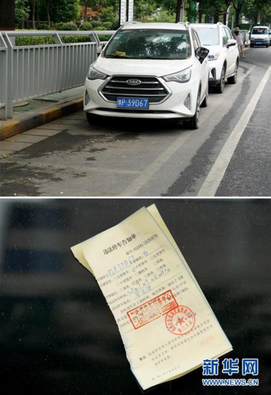 上圖:在鄭州市碧云路,車輛停在劃著停車位線的位置;下圖:車輛上被貼的“違法停車告知單”(拼版照片,7月10日攝)。據(jù)介紹,停車位原來(lái)是允許停的,后來(lái)被取消,但劃線一直沒(méi)清理干凈,很多車主被誤導(dǎo)。 -