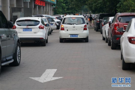 在金水東路與黃河南路交叉口西北角一條通往小區(qū)的道路上,路兩旁停滿了車輛,并不時(shí)有車輛逆行通過(guò)(7月9日攝)。 新華社記者 李安 攝 -