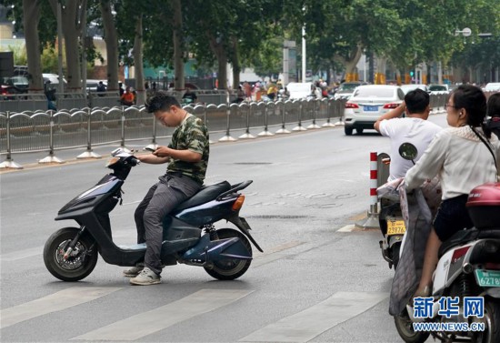 一位騎電動(dòng)車的市民停在機(jī)動(dòng)車道中間看手機(jī)(7月8日攝)。 新華社記者 李安 攝 -