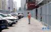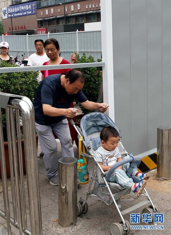 鄭州市人民公園東門設(shè)起了圍擋,老人低頭彎腰從支架三角鐵下鉆過(guò)(7月10日攝)。 新華社記者 李安 攝 -