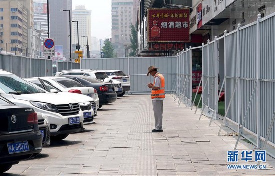 在鄭州市人民公園東門路段的圍擋內(nèi),一名工作人員對(duì)停泊車輛登記收費(fèi)(7月11日攝)。 新華社記者 李安 攝