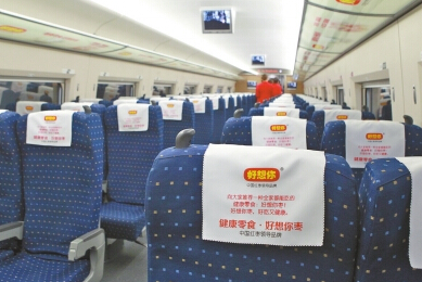 大河報記者在現(xiàn)場發(fā)現(xiàn),在和諧號動車組的車體外部,并沒有打上“好想你號”的標(biāo)識。而在車內(nèi),列車的行李架貼、頭枕片、小桌板、展板、車門貼、視頻媒體、列車廣播以及車廂兩端LED顯示屏,處處顯示著好想你棗的標(biāo)識。