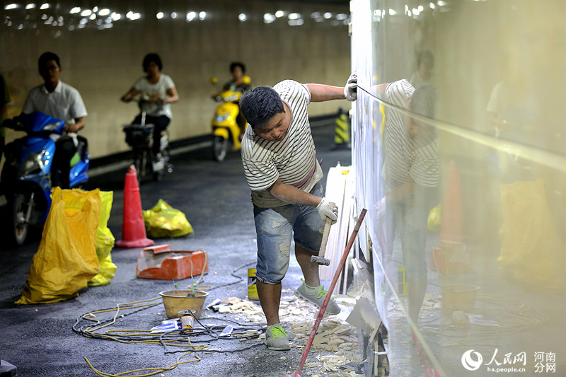 央廣網河南分網消息 “今天干到夜里12點也得把它修完,領導下任務了!9月21日晚18點左右,在河南鄭州福元路非機動車道自西向東方向下穿隧道里,一位手拿鐵錘砸墻的施工人員告訴記者。