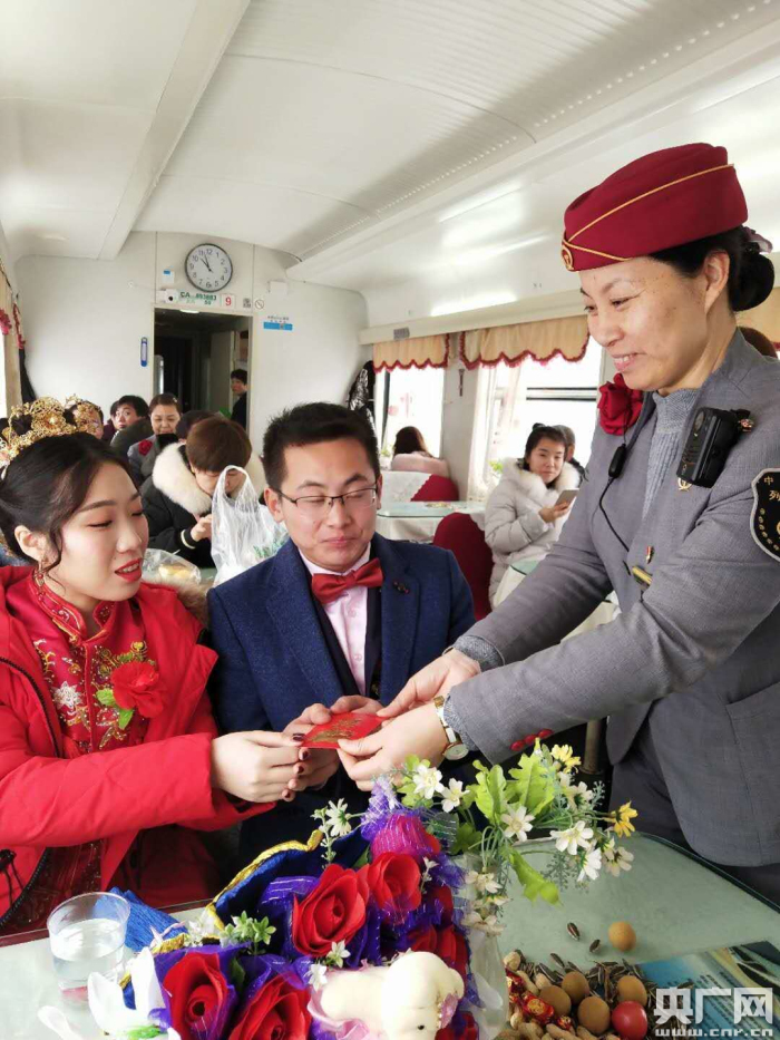 感謝列車長(zhǎng)任曉磊和副車長(zhǎng)趙鵬精心安排,我們這場(chǎng)列車上特殊的婚禮,沒(méi)有這趟小慢車,我的婚禮恐怕泡湯了,我會(huì)記住這個(gè)特殊的日子,溫暖的旅程,甜蜜的經(jīng)歷!毙吕哨w一凡說(shuō)。