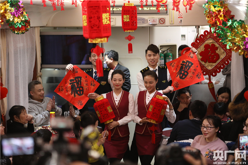 央廣網(wǎng)北京2月19日消息(記者王晶 張凱航)今天是中國傳統(tǒng)佳節(jié)元宵節(jié),春運鐵路也迎來了返程高峰。猜燈謎、吃湯圓、看歌舞……昨晚(18日),北京開往山城重慶的Z3次列車餐車張燈結(jié)彩,車上的旅客驚喜地發(fā)現(xiàn)自己趕上了由中國鐵路北京局集團公司北京客運段“傳承”文藝小分隊帶來的一臺熱鬧的文藝晚會,提前過了個歡歡喜喜的元宵節(jié)。