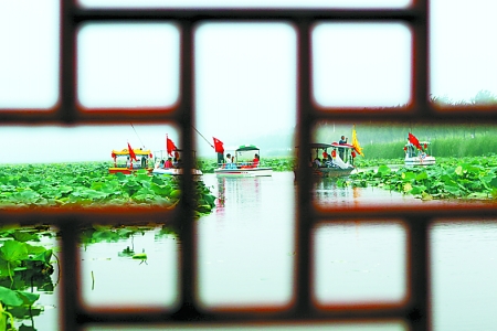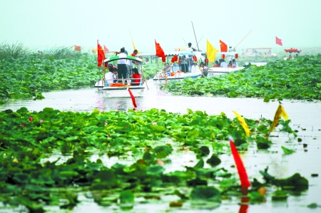 中廣網(wǎng)河南分網(wǎng)消息 據(jù)河南日?qǐng)?bào)報(bào)道: 8月6日,淮陽(yáng)縣龍湖萬(wàn)畝荷塘里姹紫嫣紅的荷花吸引著來(lái)自全國(guó)各地的游客。在煙雨朦朧中,蕩著雙槳手把船篙的船夫和游客歡快的笑聲洋溢在湖面上。