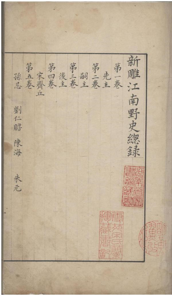 河南省圖書館館藏《江南野史》十卷,宋龍袞撰,明末毛氏汲古閣抄本,1函2冊,入選第六批國家珍貴古籍名錄(編號12509 )。此書系記錄南唐至宋初江南史事的紀傳體史書,首三卷分載南唐三主事跡,后七卷皆為南唐諸臣傳,凡三十四傳。是書鈐有“明黃翼收藏”“毛晉之印”“汲古閣”“宋本”“甲”“毛扆之印”“雪苑宋氏蘭揮藏書記”等印,表明其曾先后為明清藏書家黃翼圣、毛晉、毛扆、宋筠等所收藏。該書已入選《中國古籍善本書目》史部2400號,據(jù)原文化部頒發(fā)的《古籍定級標準》定為二級古籍。