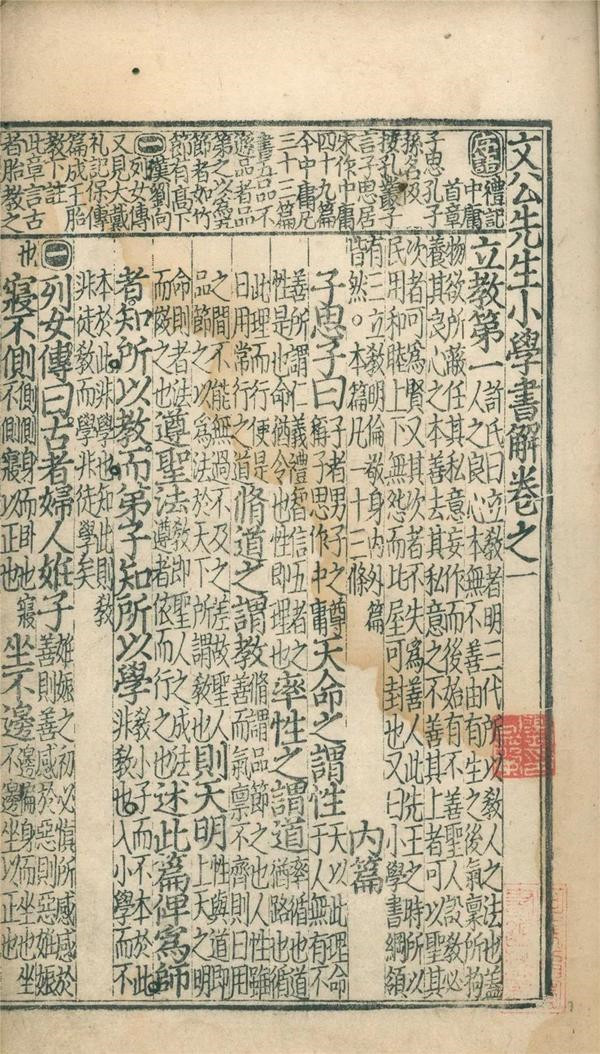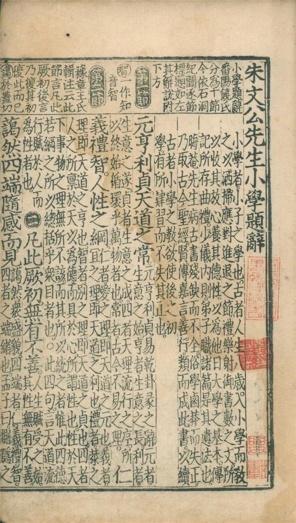 河南省圖書館館藏《文公先生小學書解》宋朱熹撰,明前期刻本,一函四冊,入選第六批國家珍貴古籍名錄(編號12625 )。小學題辭,番陽饒氏分為十節(jié)。今依石洞紀聞逐節(jié)標題如左,其解說附下方。饒魯(1193—1264)字伯輿,又字仲元,人稱雙峰先生,南宋大教育家,理學大家。曾師從朱熹高足、女婿黃干,極得器重。后赴試不第,遂專意經(jīng)學。是書分為:內(nèi)(立教、明倫、敬身、稽古)、外(嘉言、善行)兩篇六個方面。此書刻風類似元代風格,應(yīng)不晚于明早期!吨袊偶票緯俊纷硬00536,《中國古籍總目》子1-2651兩種書目僅有河南省圖書館一家收藏有此書。據(jù)原文化部頒發(fā)的《古籍定級標準》,定為二級古籍。因其獨有的文獻價值,被《元明刻本朱子著述集成》收錄,由華東師范大學出版社高仿印制出版。