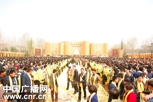中廣網(wǎng)河南分網(wǎng)消息 由政協(xié)河南省委員會、中華炎黃文化研究會、中華全國歸國華僑聯(lián)合會、中華全國臺灣同胞聯(lián)誼會主辦,由鄭州市人民政府、政協(xié)鄭州市委員會、新鄭市人民政府承辦的辛卯年黃帝故里拜祖大典“三月三(今天)在黃帝故里新鄭隆重舉行。今年的拜祖大典主題延續(xù)保持為“同根同祖同源,和平和睦和諧”,大典沿承規(guī)制,共有九項儀程,分別為:盛世禮炮、敬獻花籃、凈手上香、行施拜禮、恭讀拜文、高唱頌歌、樂舞敬拜、祈福中華、天地人和。