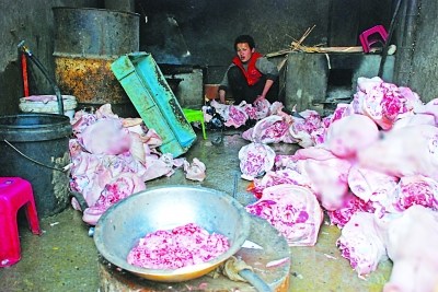 民房院門緊閉,記者根本進(jìn)不去,記者只好繞到作坊的后院,透過油膩膩的窗戶玻璃向屋內(nèi)看,只見一名女子正嫻熟地用刮胡刀刮去豬頭上面殘留的豬毛,然后麻利地將一塊塊肉扔向墻角。在另一邊有一口大鐵鍋,里面盛著大半鍋黑色、粘稠的液體,散發(fā)著刺鼻嗆人的氣味。