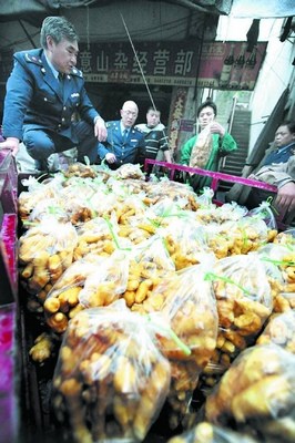 工商執(zhí)法人員在現(xiàn)場收繳“毒生姜”。新華社發(fā)