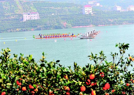 12月12日,在秭歸縣水田壩鄉(xiāng)吒溪河,參賽龍舟隊伍奮力爭先。當(dāng)日,第十屆湖北省龍舟大賽吒溪河舉行,來自全省的12支龍舟隊伍展現(xiàn)龍舟激情,喜慶臍橙豐收。