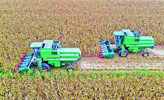 9月3日,當(dāng)陽市草埠湖鎮(zhèn)楚湖村,多臺大型玉米聯(lián)合收割機(jī)在連片的玉米地里搶收玉米,確保秋糧顆粒入倉。入秋后,隨著玉米、水稻等農(nóng)作物陸續(xù)成熟,我省拉開今年的秋收大幕。據(jù)該市農(nóng)業(yè)部門測算,全市秋收水稻預(yù)計29.3萬噸,玉米預(yù)計9.34萬噸。