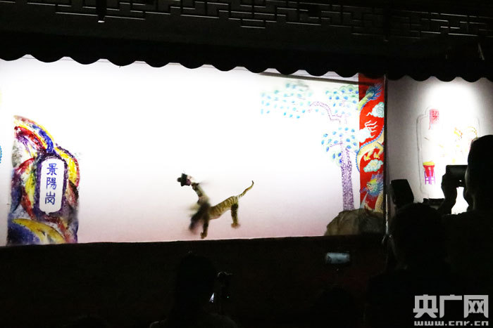 在孝感臥龍島非遺文化園內(nèi),一場精彩絕倫、緊張激烈的皮影戲經(jīng)典劇目《武松打虎》正在熱鬧開唱,幕布背后表演的正是湖北工藝美術(shù)名人秦禮剛。
