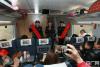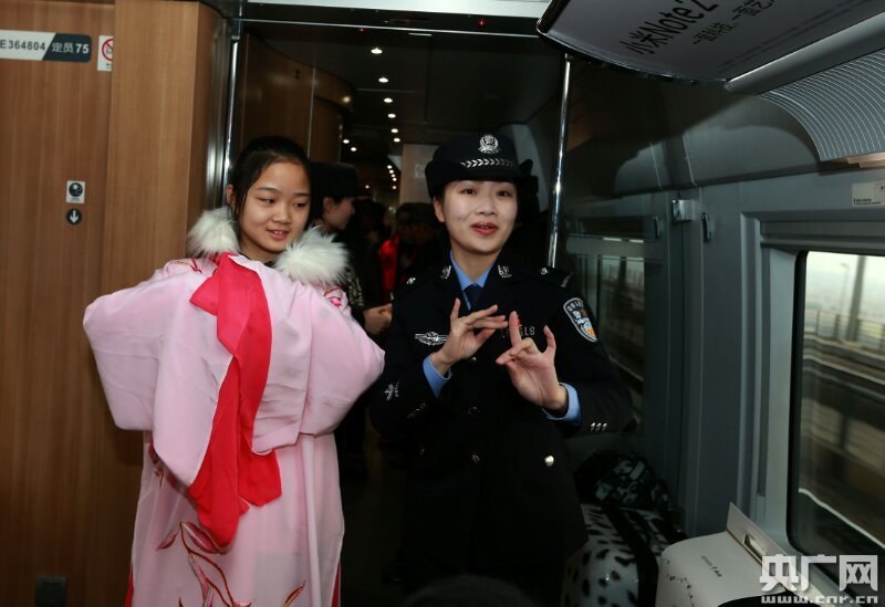 1月31日,楊越〔左〕在G1748高鐵6車廂和旅客互動,共享春節(jié)乘車快樂。 -