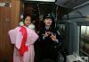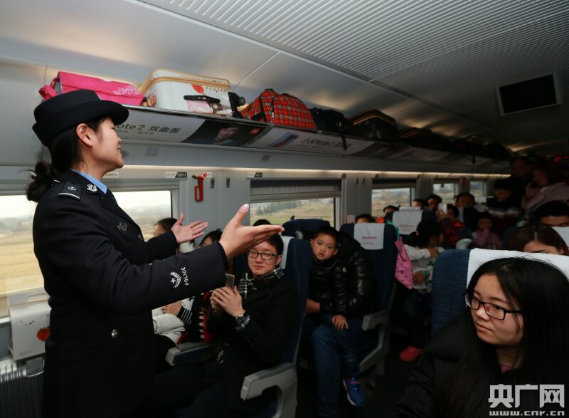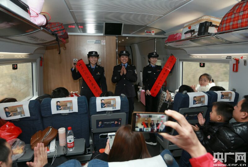 1月31日,楊越〔右〕、肖安玉〔中〕給G1748高鐵6車廂旅客拜年,祝旅客一路平安。 -