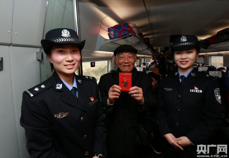 1月31日,楊越〔右〕給G1748高鐵最大年齡81歲的旅客孟慶環(huán)〔中〕送上鐵警祝福。