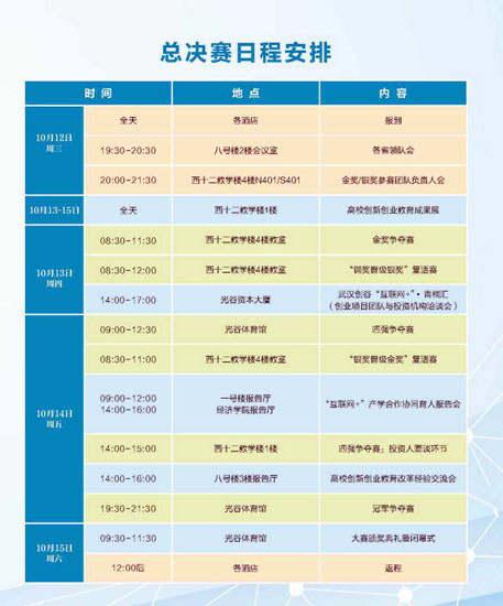 本屆大賽將參賽項(xiàng)目分為創(chuàng)意組、初創(chuàng)組、成長組,并根據(jù)行業(yè)領(lǐng)域細(xì)化為6大類、27個(gè)行業(yè),便于投資人和大學(xué)生項(xiàng)目精準(zhǔn)對(duì)接。華中科技大學(xué)團(tuán)委書記王小月透露,本屆大賽新增了“互聯(lián)網(wǎng)+”現(xiàn)代農(nóng)業(yè)、“互聯(lián)網(wǎng)+”公益創(chuàng)業(yè)兩個(gè)比賽項(xiàng)目;增加了“創(chuàng)客”文化展區(qū)、。ㄊ、區(qū))科技園展區(qū)、投融資機(jī)構(gòu)展區(qū)等三個(gè)項(xiàng)目展區(qū);觀摩方式由幾百人的現(xiàn)場(chǎng)觀摩拓展為開放觀摩、網(wǎng)絡(luò)直播相結(jié)合,實(shí)現(xiàn)同一時(shí)間3000余人現(xiàn)場(chǎng)觀摩和實(shí)時(shí)網(wǎng)絡(luò)觀摩;增加了配合全國大學(xué)生創(chuàng)業(yè)服務(wù)網(wǎng)開展線上線下項(xiàng)目對(duì)接、引入武漢知識(shí)產(chǎn)權(quán)交易所等措施,豐富項(xiàng)目轉(zhuǎn)化平臺(tái)的建設(shè),提升項(xiàng)目轉(zhuǎn)化效率;大賽期間武漢市政府積極參與組織工作,舉辦融資洽談會(huì),邀請(qǐng)武漢市市長親自為創(chuàng)業(yè)者站臺(tái),為成果落地發(fā)聲。