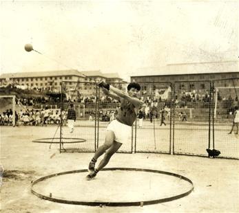 圖為:1958年,華中工學(xué)院學(xué)生擲鏈球。