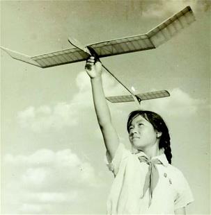 圖為:1957年,藍(lán)天白云下,手托牽引滑翔航模的武漢少先隊員。