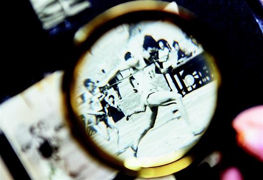 圖為:2019年3月22日,陳勇手持放大鏡聚焦在一張老照片上。畫面中展示的是1959年第三屆湖北省運動會上男子百米短跑的沖刺場面。