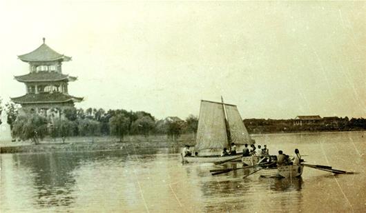 圖為:槳聲閣影。1958年,東湖行吟閣旁的舢板比賽。行吟閣落成于1954年,是東湖風(fēng)景區(qū)的標(biāo)志性景觀。