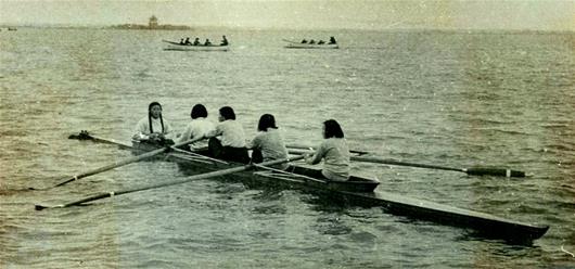 圖為:東湖競技。1958年,女子四人有舵手賽艇訓(xùn)練。
