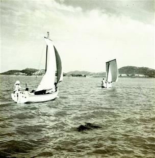 圖為:湖上白帆。1958年9月23日至25日,武漢帆船隊參加在武漢東湖舉辦的全國帆船比賽。