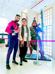 圖為:軍運會期間,外國運動員與劉潔在兩米多高的關(guān)公面塑作品前留影