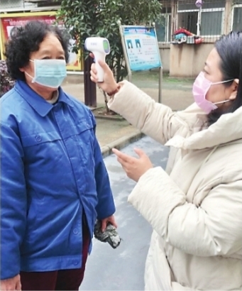 22日,青山區(qū)鋼花村街110社區(qū)工作人員為居民測量體溫