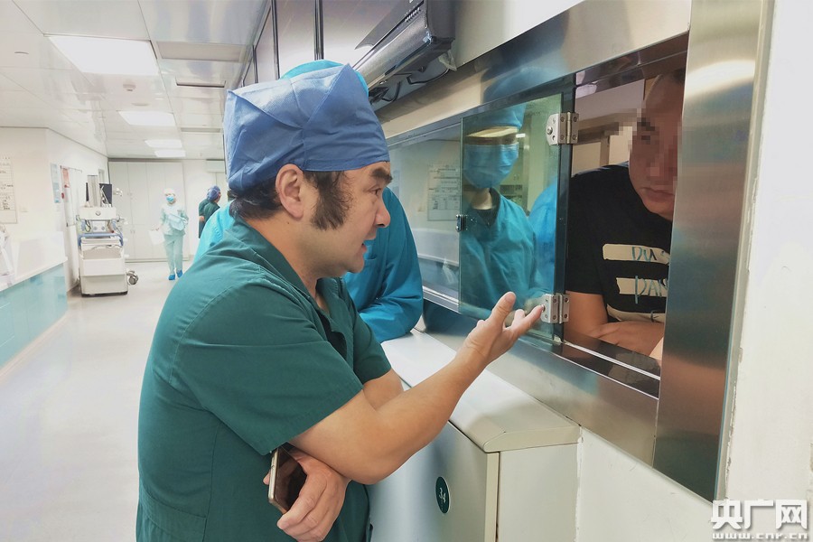 圖為余主任在與患者家屬溝通(央廣網(wǎng)記者 黃炎秋 攝)