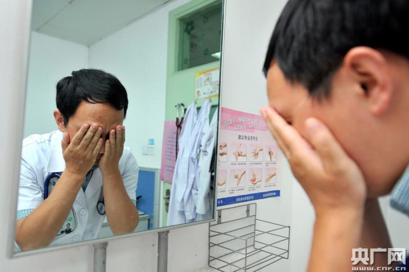 圖為疲憊不堪的羅醫(yī)生利用交辦前的空隙洗臉(央廣網(wǎng)發(fā) 通訊員陶繼東 攝)