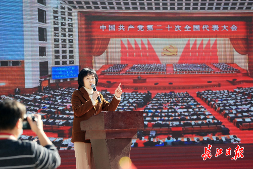 音樂(lè)展示《國(guó)際歌》《春天的故事》《理想》、聽(tīng)歌識(shí)曲《東方紅》《游擊隊(duì)歌》《紅梅贊》、湖北大鼓《二十大精神指航向》、全場(chǎng)合唱《沒(méi)有共產(chǎn)黨就沒(méi)有新中國(guó)》……課程圍繞黨的二十大主題、大會(huì)報(bào)告的主要內(nèi)容和核心要義進(jìn)行了系統(tǒng)闡述,同時(shí)音樂(lè)與黨課互相交融,現(xiàn)場(chǎng)觀(guān)眾在紅色經(jīng)典曲目中感受一幕幕或悲壯激烈,或輝煌壯麗的黨史畫(huà)卷。